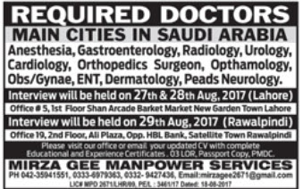 Interview will be held on 27th & 28th Aug, 2017. (Lahore)